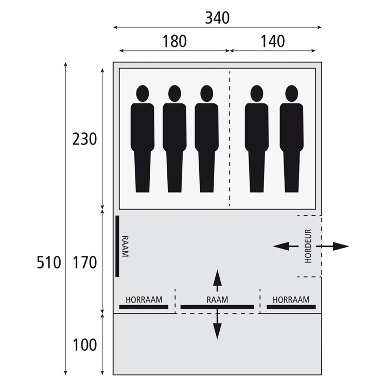 De tunneltent is uitgerust met twee slaapcabines die geschikt zijn voor twee en drie personen. Deze slaapcabines zijn extra donker en hebben een lengte van 230 cm. De wegritsbare scheidingswand zorgt voor een flexibele indeling van deze slaapcabines.