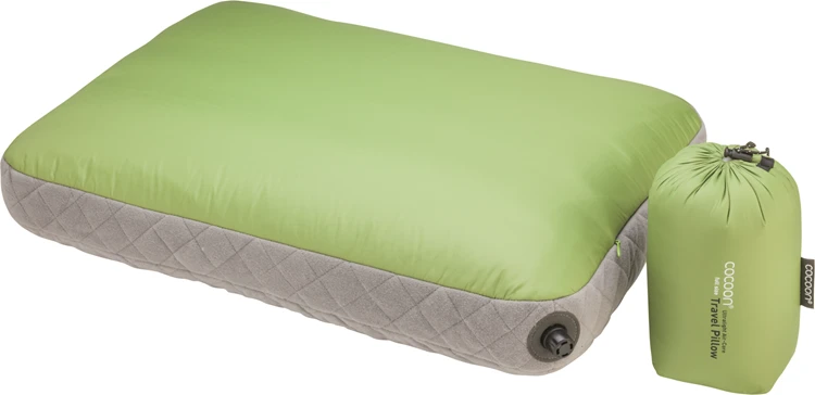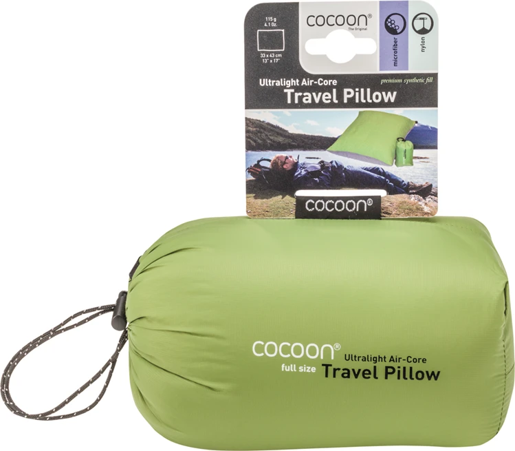 Het Air-Core Ultralight kussen van Cocoon is een ultralight reiskussen met hoogwaardige synthetische vulling. Het Air-Core Ultralight kussen is door middel van een een draaiventiel makkelijk met de mond op te blazen en ook weer leeg te laten lopen. Eén zijde is gemaakt van geborsteld polyester microvezel, dit materiaal voelt zacht en prettig aan. De tweede zijde is gemaakt van glad nylon en is hiermee vuilafstotend. Dit kussen onderscheidt zich ten op zichte van andere reiskussens op twee punten. Ten eerste is het relatief groter dan andere reiskussens zonder veel pakvolume in te nemen. Ten tweede zorgt de synthetische omhulling van het kussen ervoor, dat je niet het gevoel hebt op een ballon te liggen, maar op een volwaardig kussen.Kortom een ideaal reiskussen voor de reiziger, die comfortabel wil slapen.