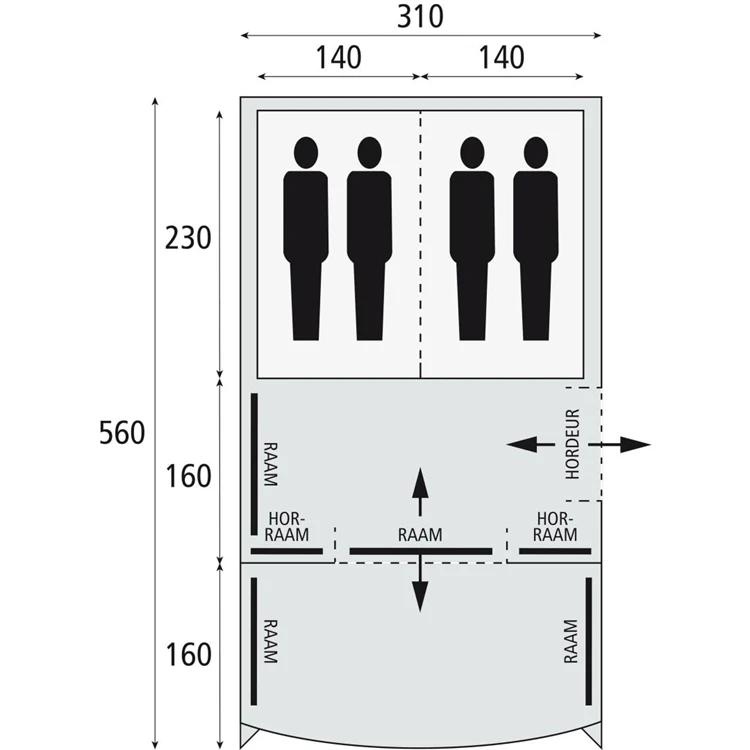 De Safarica Indian Hills 310 Air is een luxe opblaasbare kampeertent voor 3 tot 4 personen. Deze tunneltent van polyester heeft een waterkolom van 4000 mm en is erg eenvoudig op te zetten. U zet deze simpelweg op met een drietal oppompbare luchtslangen en een glasfiber stok om de vaste luifel te ondersteunen. Deze tent heeft een mooie lichtinval dankzij de grote ramen en is te betreden via een voor- en zijingang. De tent is voorzien van een innovatief Airframe met 10 cm dikke TPU luchtslangen met geknikte hoeken om een rechte wand te creëren. Zo kunt u alles uit de ruimte halen! Daarnaast geniet u in de hele tent van een comfortabele stahoogte. Deze leefruimte heeft een vastgestikt kuipgrondzeil met neerklapbare randen aan de voorzijde voor een drempelloze toegang. De grote, donkere binnentent is eenvoudig te bevestigen en is tevens voorzien van een scheidingswand. Deze scheidingswand kunt u, net als de voorwand van het leefgedeelte, eenvoudig weghalen om de ruimte te vergroten. De gehele tent heeft goede ventilatiemogelijkheden en dient rondom afgespannen te worden met meegeleverde scheerlijnen en haringen. Daarnaast wordt de tent ook geleverd met een pomp en een handige draagtas. Met de Safarica Indian Hills 310 Air kunt u het lekker luchtig houden als u gaat kamperen met uw gezin!De Safarica Indian Hills 310 Air is snel opzetbare polyester tunneltent met luchtslangen. Deze heeft voldoende ruimte om een comfortabel verblijf te bieden voor 3 tot 4 personen. Deze lichtgewicht opblaastent heeft een innovatief frame met oppompbare luchtslangen (10 cm doorsnede). Zowel het slaapgedeelte als het leefgedeelte is flexibel in te delen dankzij een wegritsbare of wegrolbare wand. Zo kunt u van de 2 slaapcabines eenvoudig 1 grote slaapcabine maken en de ruimte onder de vaste luifel bij de voorbouw betrekken. Deze tent heeft ook een mooie lichtinval dankzij grote ramen en beschikt tevens over voldoende ventilatiepunten. Door het Airframe met geknikte hoekstukken zijn de zijwanden van deze tent veel rechter ten opzichte van andere tunneltenten, waardoor u echt iedere centimeter van het leefgedeelte kunt benutten. Daarnaast is de hele tent voorzien van een comfortabele stahoogte voor nog meer bewegingsvrijheid. De leefruimte heeft een vooringang met een neerklapbaar grondzeil, voor een drempelvrije doorgang, maar is ook via een brede zij-ingang te bereiken. Deze tent weegt slechts 20 kg. Daarnaast is deze tunneltent in zijn totaliteit eenvoudig op te zetten met een drietal oppompbare luchtslangen. De vaste luifel wordt ondersteund door een glasfiber boogstok. De gehele kampeertent dient rondom afgespannen te worden met meegeleverde scheerlijnen en haringen. Ook wordt er bij deze tent een pomp en een handige draagtas geleverd. De Safarica Indian Hills 310 Air is door zijn opzetgemak de ideale tent voor korte kampeervakanties met een kleine gezinssamenstelling!Flexibel in te delen donkere slaapcabineDe Safarica Indian Hills 310 Air heeft een donkere slaapcabine met een flexibele indeling! De gehele binnentent heeft een afmeting van 230 cm bij 280 cm. Deze bestaat uit 2 slaapcabines voor 2 personen met elk een afmeting van 230 cm bij 140 cm. De scheidingswand kunt u wegritsen om er 1 slaapcabine van te maken. Daarnaast zijn de deuren van het slaapvertrek voorzien van een afsluitbaar ventilatiepaneel, waardoor u vervelende insecten ’s nachts buiten het slaapvertrek kunt houden tijdens het ventileren. De binnentent heeft een comfortabele hoogte van 190 cm. U kunt de binnentent met een ring-pin-systeem eenvoudig bevestigen aan de luchtslangen. Bij het afbreken van de Air-tent wordt deze binnentent vaak niet meer losgehaald en zal deze vast blijven hangen aan de buitentent om de opzettijd tijdens uw volgende kampeertrip te verkorten. In de Safarica Indian Hills 310 Air slaapt u dus op wolken!Leefruimte met vast grondzeil en luifelDe Safarica Indian Hills 310 Air heeft een flexibel in te delen leefgedeelte. Deze voorbouw kunt u namelijk gewoon uitbreiden door de vaste luifel erbij te betrekken. Dit kan door de voorwand van het leefgedeelte weg te rollen en het grondzeil neer te klappen. De voorbouw heeft een afmeting van 160 cm bij 310 cm en de vaste luifel biedt nog een extra ruimte met een diepte van 160 cm. De luifel zorgt direct voor extra schaduw, maar ook voor een droge instap. Door deze luifel kan het niet direct binnen regenen en kan de ventilatie van de voordeur blijvend gebruiken. Het leefgedeelte is ook voorzien van een mooie lichtinval dankzij de grote ramen die u ook traploos kunt verduisteren met een polyester gordijn met ritsen. Dankzij de ruime leefruimte, kunt u ook heerlijk vertoeven in deze tent als het weer u in de steek heeft gelaten! Bovendien heeft de tent in het leefgedeelte een comfortabele stahoogte van 210 cm zodat u voldoende bewegingsvrijheid heeft. Het leefgedeelte en de slaapcabines beschikken tevens over een aantal handige opbergvakken. De Safarica Indian Hills 310 is een handige tent om lekker met het gezin te gaan kamperen!MateriaalDe Safarica Indian Hills 310 Air is deel van de Air Line van Safarica. Deze tenten zijn op te zetten met een pomp en de TPU luchtslangen in plaats van stokken. Dat maakt de pakmaat groter, maar het gewicht blijft lekker licht. De buitentent en de vastgestikte luifel zijn gemaakt van honeycomb polyester met een waterkolom van 4000 mm. De waterkolom gaat over hoeveel water het doek kan verdragen voordat het water er doorheen lekt. Als een tentdoek een waterkolom van 4000 mm heeft, wil dat eigenlijk zeggen dat het doek pas water doorlaat wanneer er een druk op het doek komt te staan die vergelijkbaar is met het gewicht van een kolom water van vier meter hoogte. Het voordeel van polyester is dat het licht van gewicht is, een kleinere pakmaat heeft en snel droogt. Het nadeel is dat dit een minder ademend vermogen heeft dan bijvoorbeeld (technisch) katoen waardoor u extra goed moet ventileren. Gelukkig biedt deze Safarica tent ook volop manieren om (