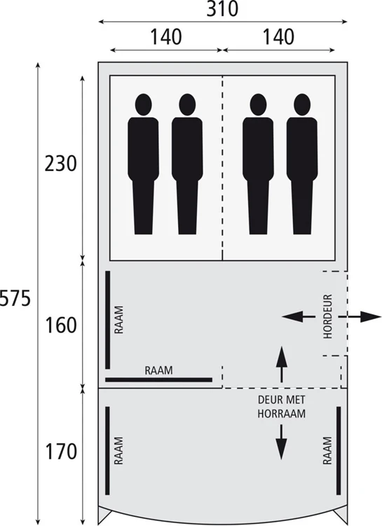 De tent heeft scheidingswanden die wegritsbaar zijn waardoor de binnentent flexibel in te delen is. Met aanwezigheid van de scheidingswand zijn er twee slaapcabines voor twee personen. Deze slaapcabines bieden optimaal slaapcomfort door de extra lange lengte van 230 cm en de extra donkere binnentent. De tunneltent van Safarica biedt voldoende opbergruimte door de opbergzakken in de slaapcabine. De tent heeft tot slot een zij-ingang en de leefruimte is optioneel te vergroten door het wegrollen van de voorwand.
